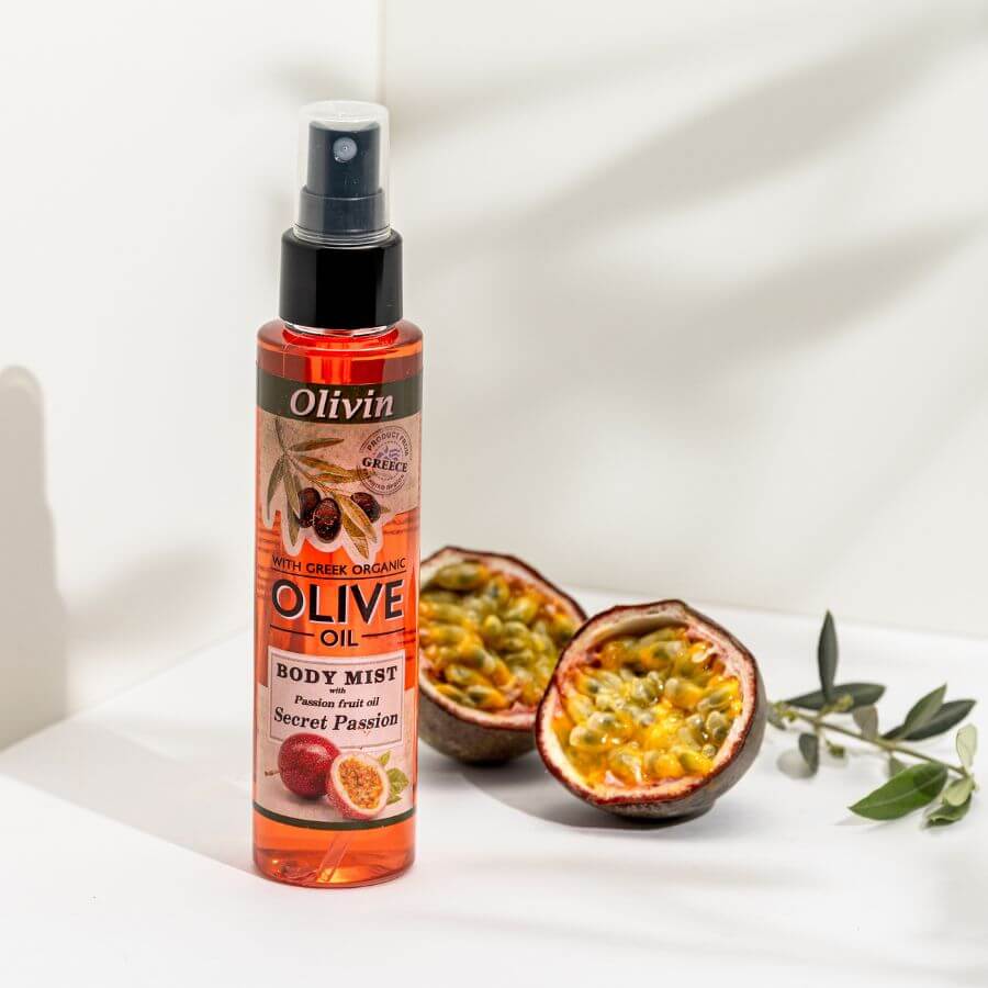 Fleurige Body mist met extract van passievruchtoliën en olijfbladeren voor hydratatie en antioxiderende bescherming.