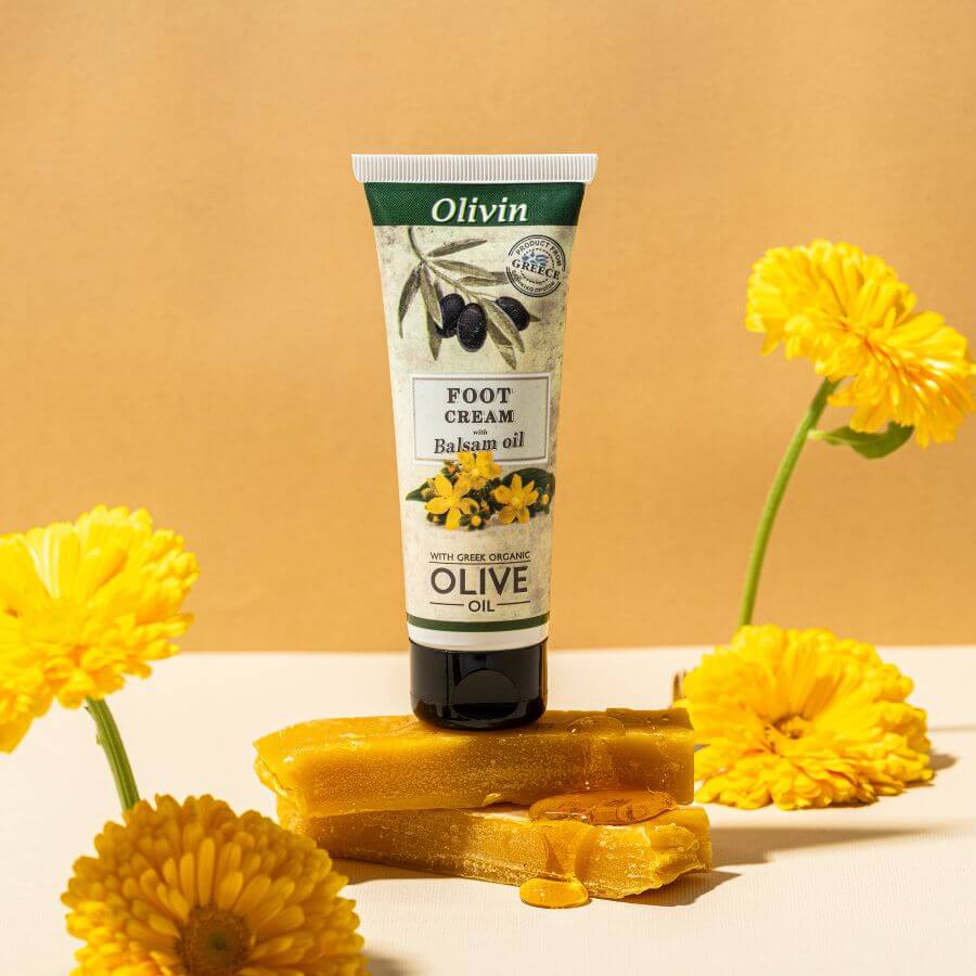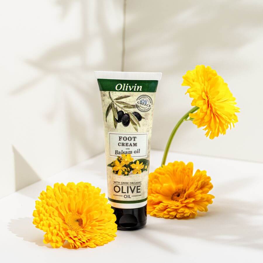 Voetcrème met balsemolie, biologische olijfolie en sheaboter, die de huid van de voeten hydrateert en voedt, en de natuurlijke zachtheid herstelt.