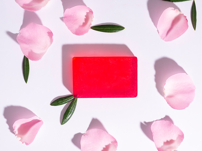 Een ambachtelijk ogende handgemaakte zeep met biologische olijfolie en rozenextract, geparfumeerd met natuurlijke essentiële oliën en botanische elementen.