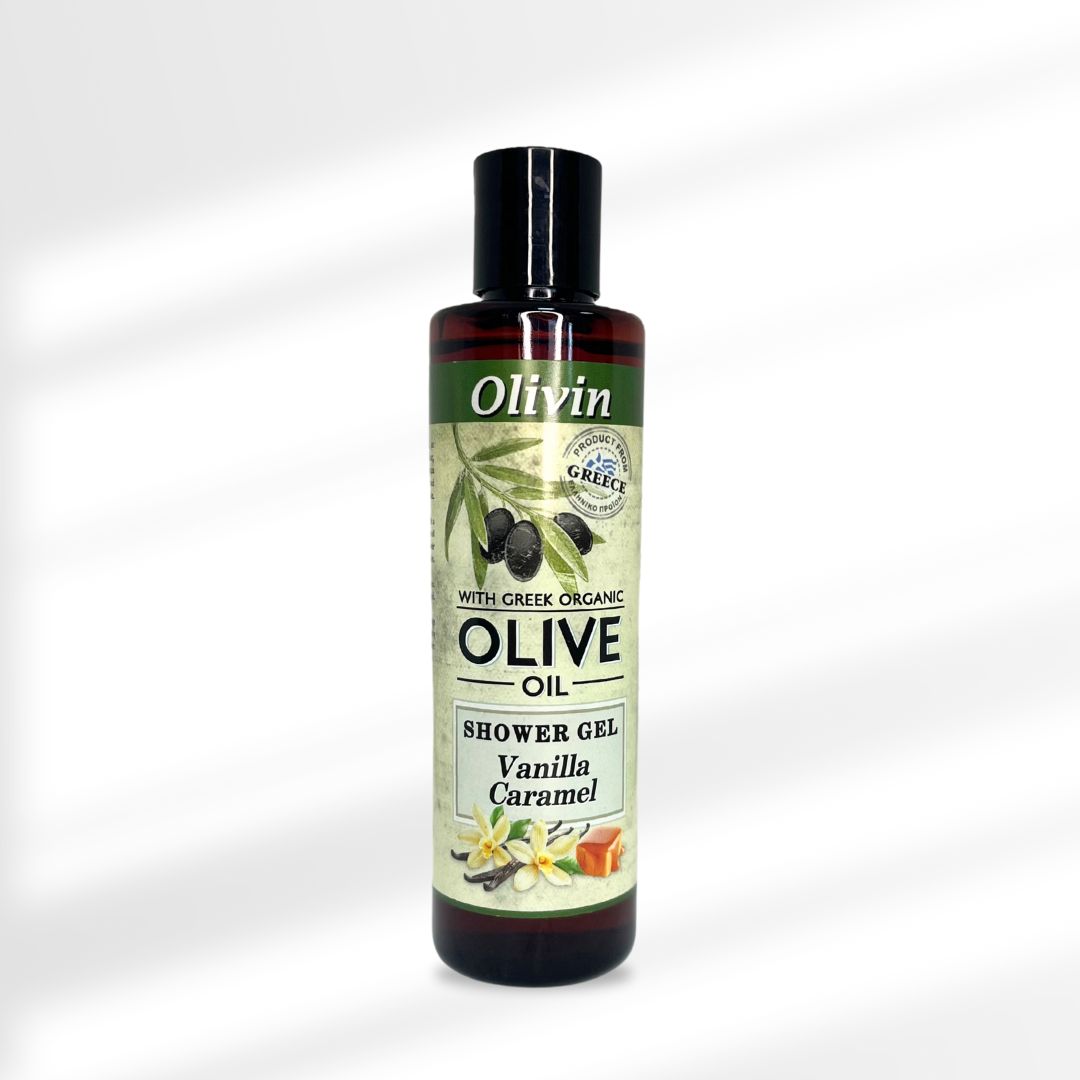 Douchegel voor een zachte reiniging, met een unieke karamelsmaak, biologische olijfolie en vanille-extract, die hun heilzame eigenschappen aan de huid geven.